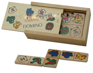 Box contains 28 wooden dominoes, which pack neatly away in this sturdy wooden box, closes neatly with a sliding wooden lid.