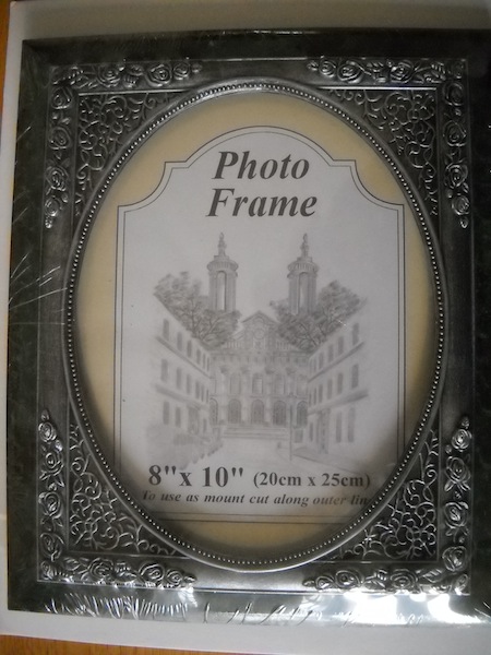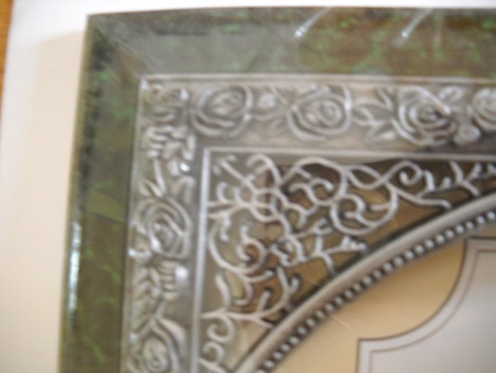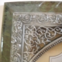 The outside of the frame is a marble effect green, and this sets off the oval frame which has roses and filigree work in a pewter colour.