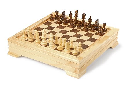 Beautifully crafted wooden box containing boards and pieces for playing draughts, chess, backgammon and cribbage.