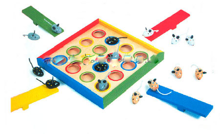 Place the mice on the see saw and strike the end, see if you can make the mice fly into your coloured circle.