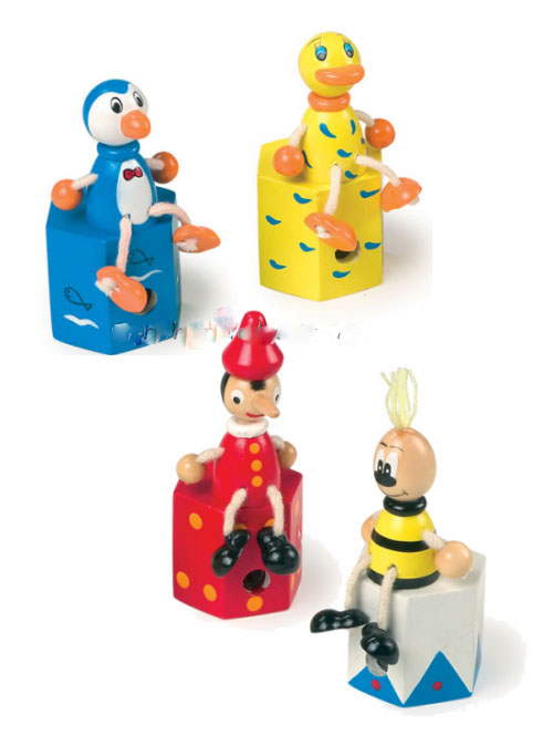 A set of four wooden pencil sharpeners each decorated with a fun figure.