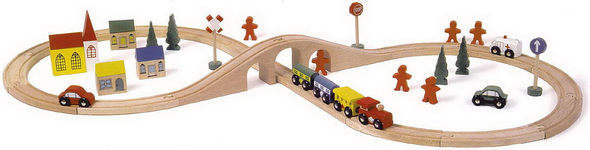 A large wooden railway containing 46 pieces-for example: shop’s, cars, train and people.