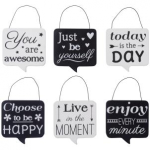 Six different quotations on a “speech bubble” wooden plaque, each with its own hanger. Not quite one for each day of the week.